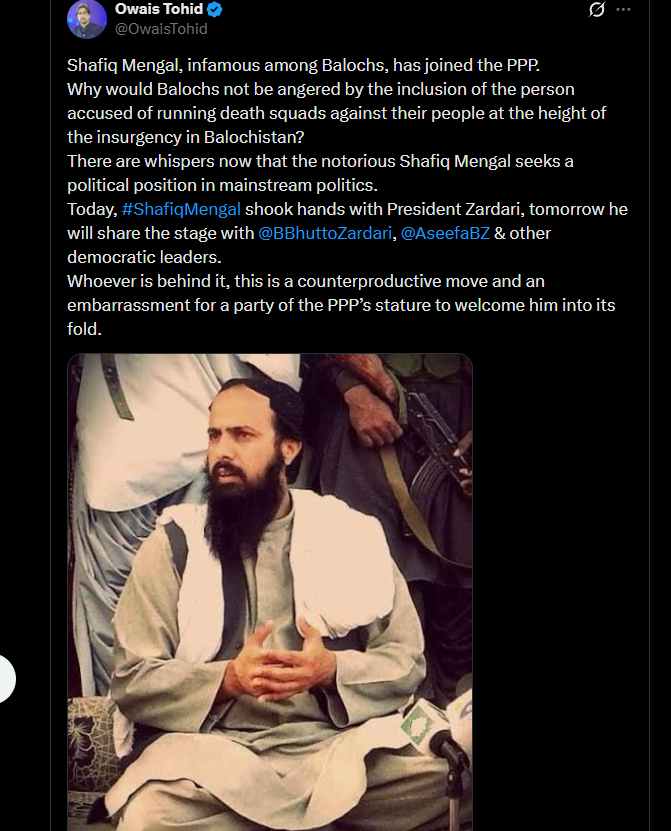 پاکستان پیپلزپارٹی کے مرکزی سوشل میڈیا سیل نے بلوچستان کی متنازعہ ترین شخصیت شفیق مینگل کی صدر مملکت آصف علی زرداری سے ملاقات کی تصویر اپ لوڈ کرتے ہوئے پی پی پی میں شمولیت کی خبر سوشل میڈیا پر جاری کی