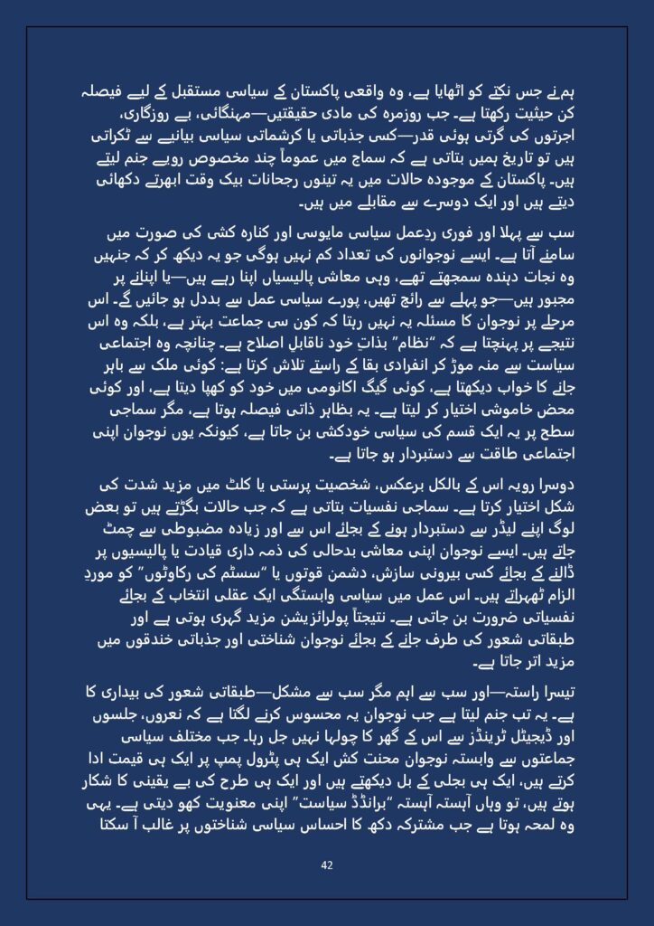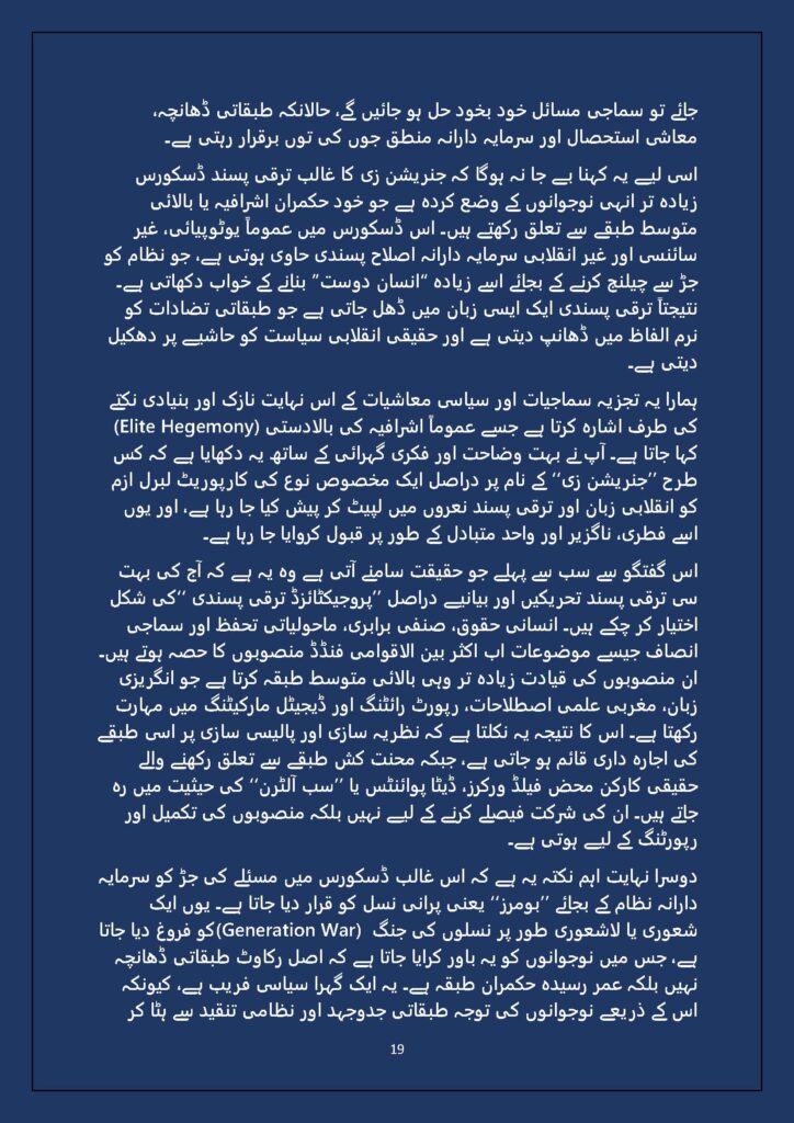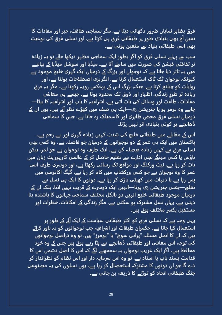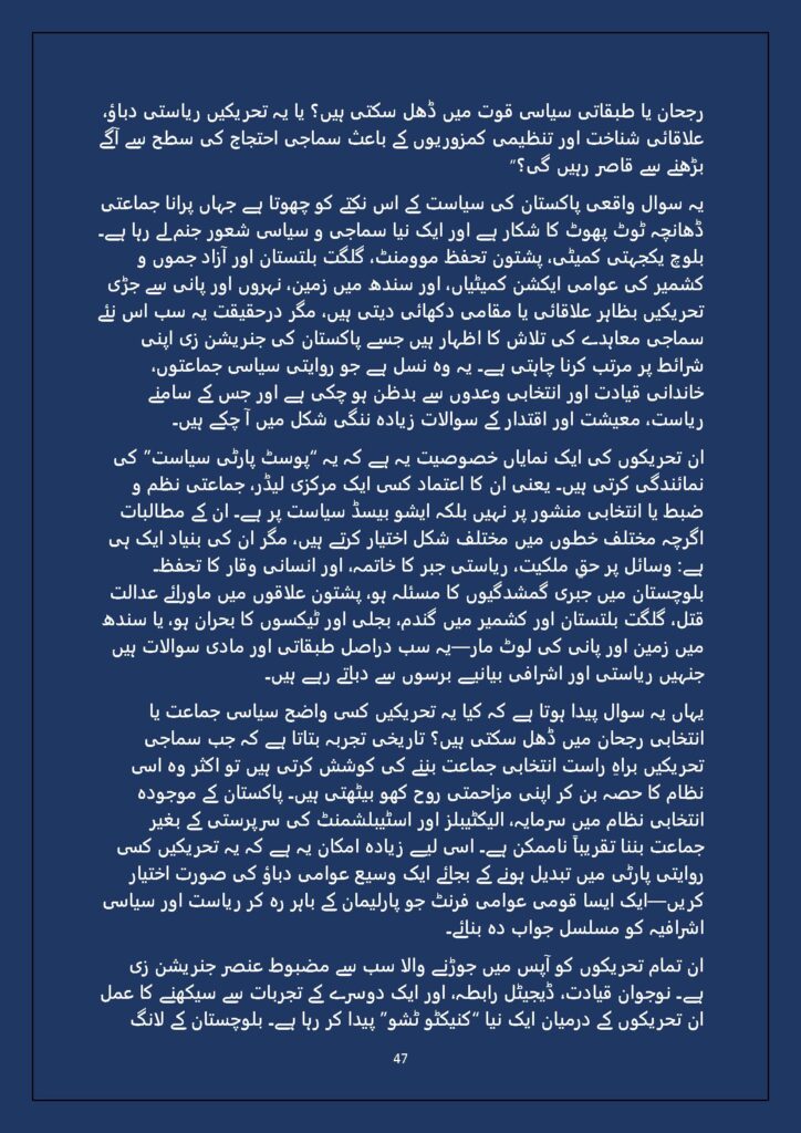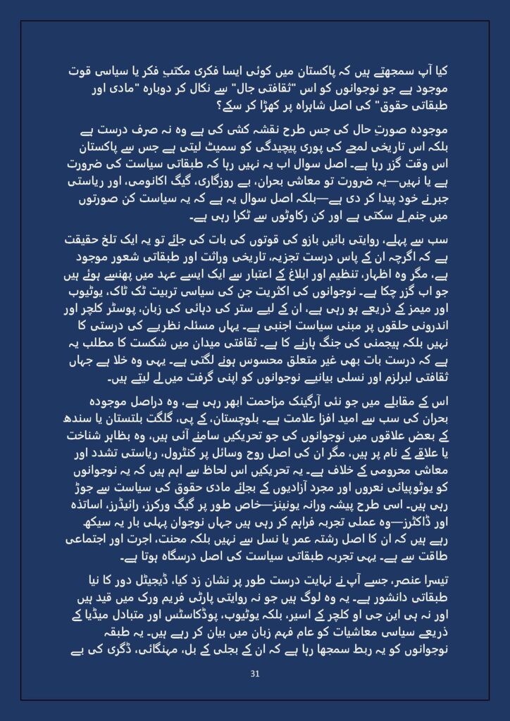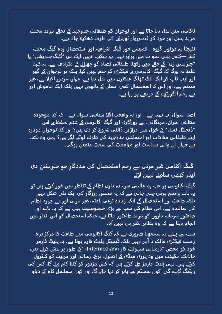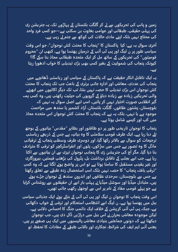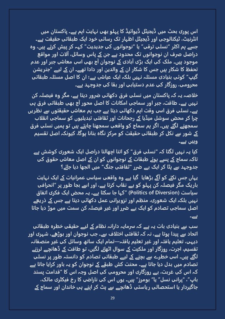 Grounded in Pakistan’s political economy yet resonant across the Global South, this study situates Gen Z within ongoing material struggles—from gig workers and urban laborers to peripheral regions resisting dispossession. It asks urgent questions: Can emerging movements transcend identity fragmentation and evolve into class-based solidarity? Will digital visibility translate into material power? And can a generation move beyond algorithmic illusions toward collective political agency?