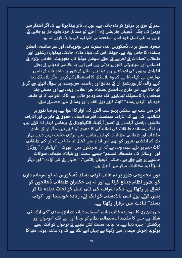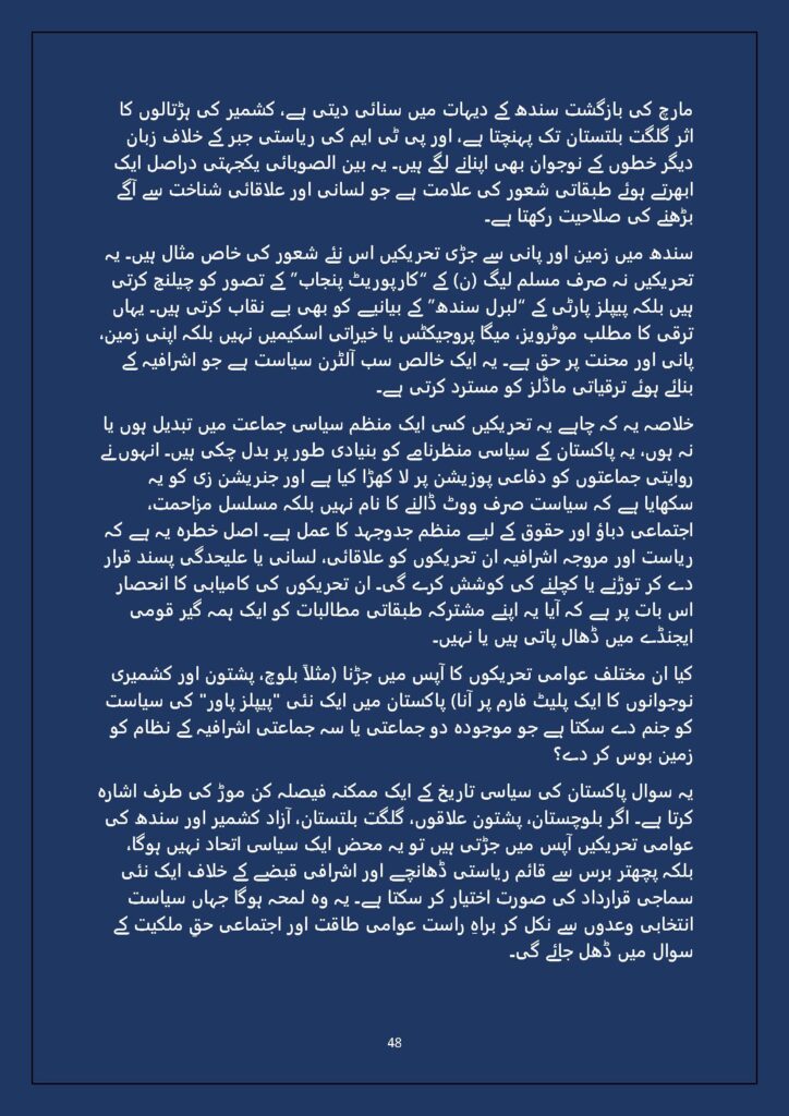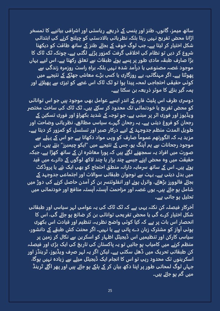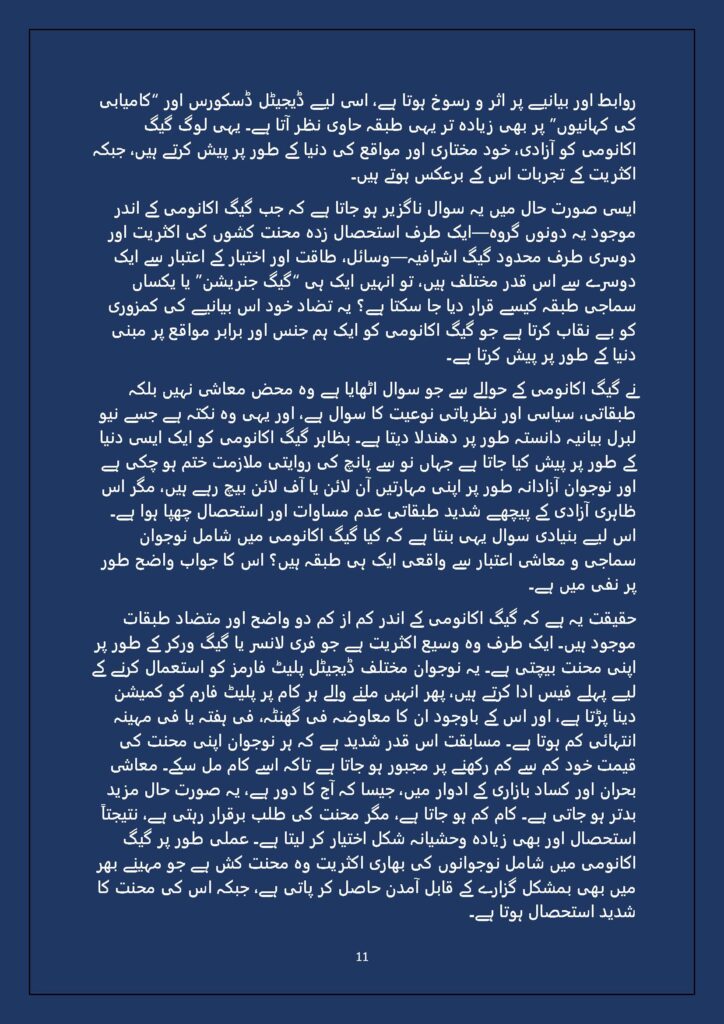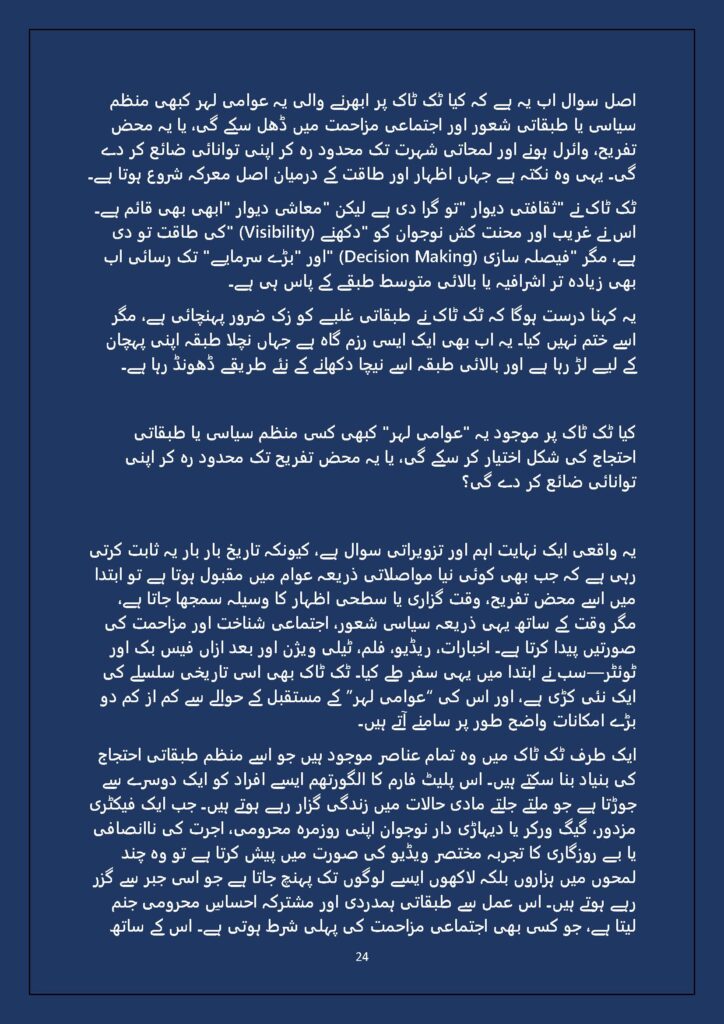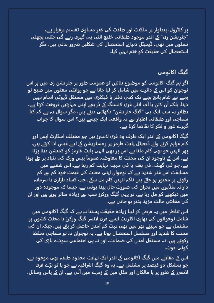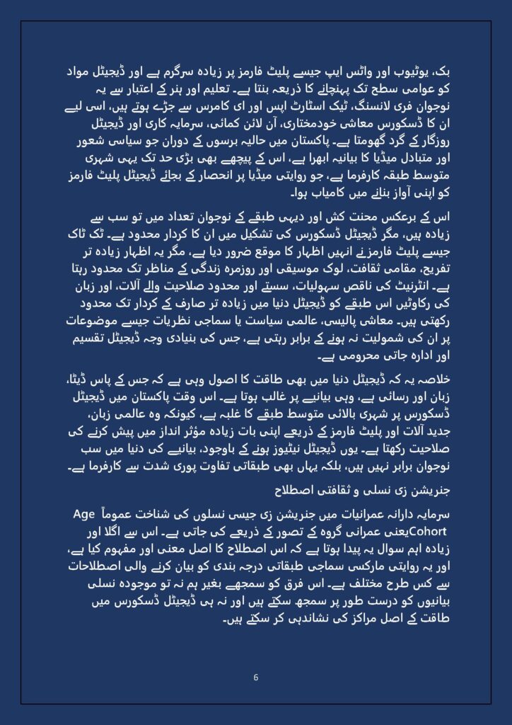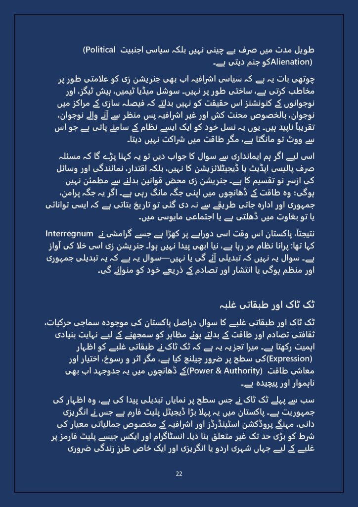 Grounded in Pakistan’s political economy yet resonant across the Global South, this study situates Gen Z within ongoing material struggles—from gig workers and urban laborers to peripheral regions resisting dispossession. It asks urgent questions: Can emerging movements transcend identity fragmentation and evolve into class-based solidarity? Will digital visibility translate into material power? And can a generation move beyond algorithmic illusions toward collective political agency?