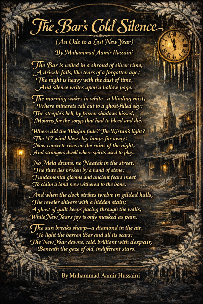The sun breaks through—a diamond, sharp and cold… The New Year comes… In shadows dancing on a ghost-filled street. Exegesis: The sun is “sharp and cold”—it does not warm; it merely exposes the “scars” of the Bar. The New Year is “ancient” because it repeats the same cycle of colonial exploitation. To me, the “ghost-filled street” represents the Seraiki national question: a people present in body but treated as ghosts in the census, the budget, and the history books.